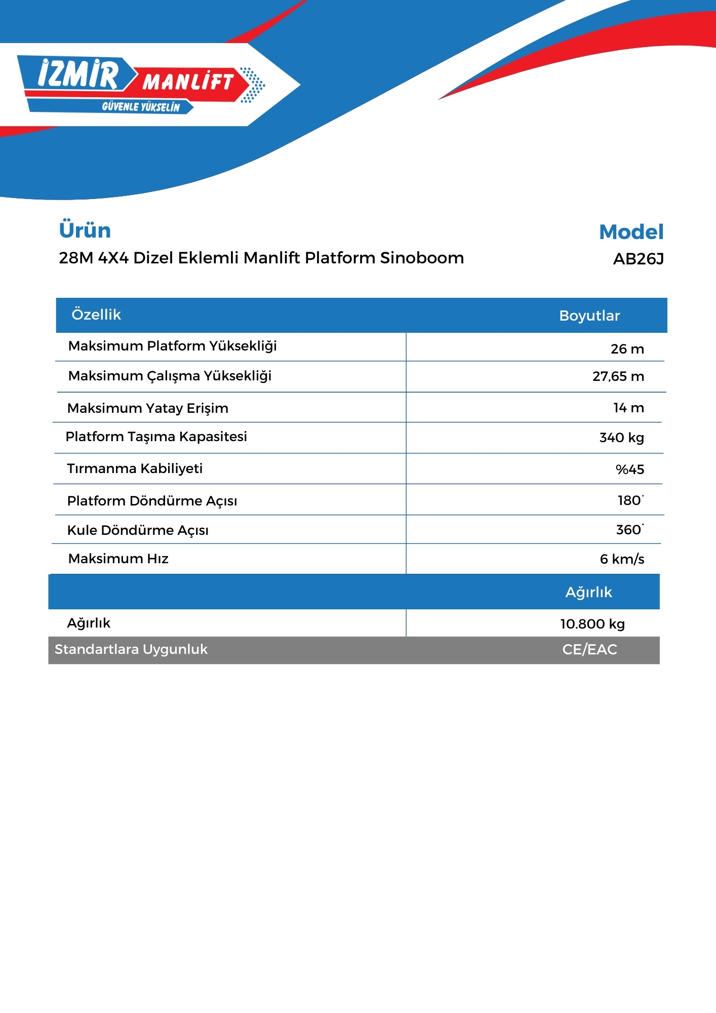 28MT 4×4 Akülü Eklemli Manlift Platform Sinoboom AB26EJ Plus